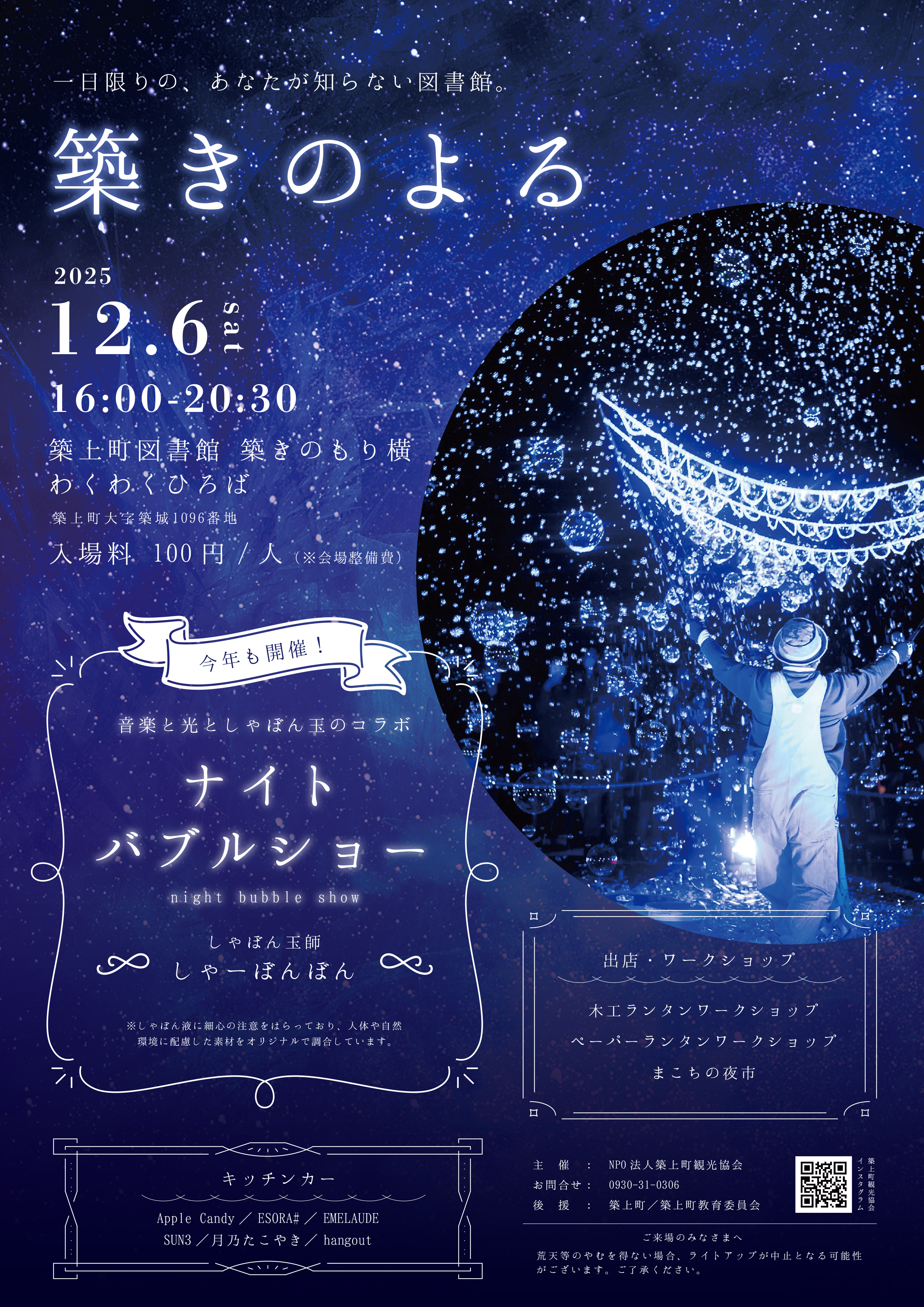築上町図書館 築きのもり図書館横わくわく広場でナイトバブルショーを開催します。