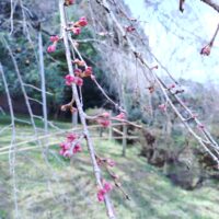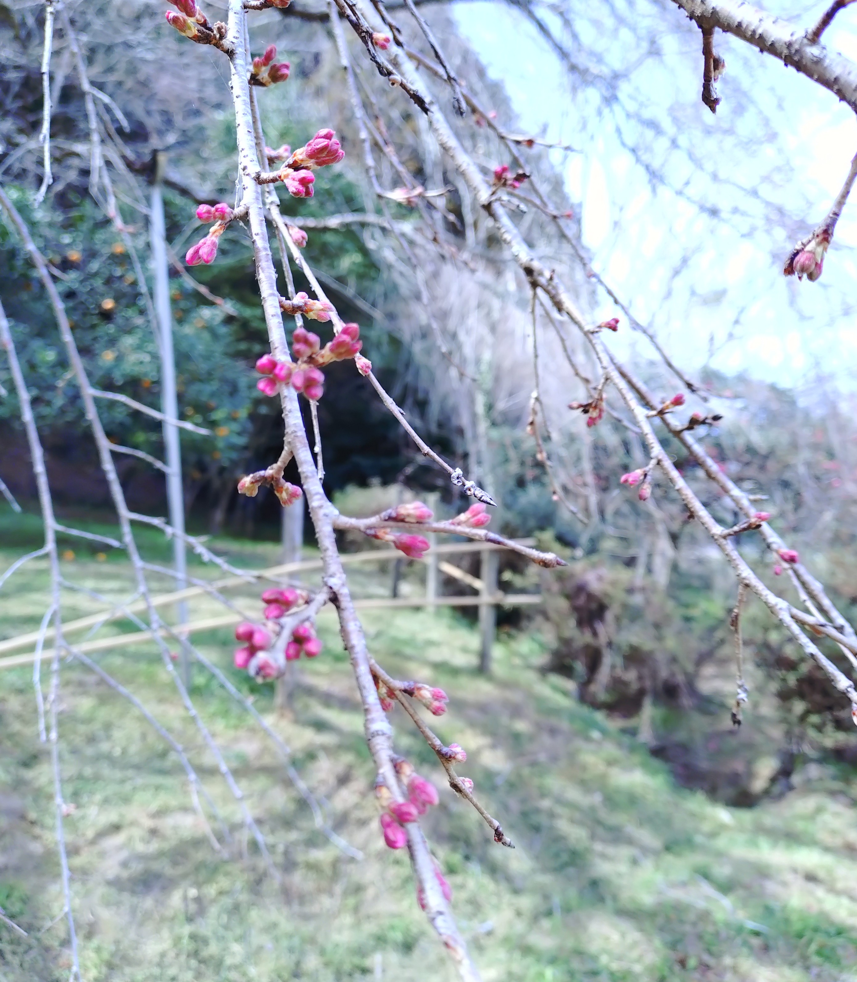 しだれ桜のつぼみの先がピンク色になり、膨らんでいます。